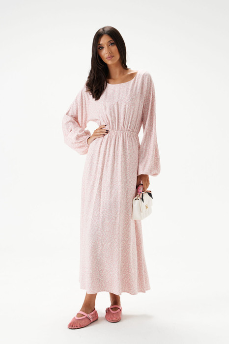 Платье - миди полуприлегающего силуэта выполнено из розового полотна с белым цветочным принтом. Горловина овальная. Отрез ниже талии на резинке. По лифу спинки вырез с завязками. Рукав спущенный, присборен на резинку. Длина платья 132 см, длина рукава 76 см