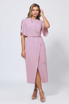 Платье из трикотажного полотна «кулирка» с набивным рисунком, отрезное по талии, с короткими втачными рукавами, горловиной V-образной формы, окантованной основным материалом и карманами в боковых швах. Полочка – с рельефами, выходящими из плечевых швов. Входы в карманы окантованы. Юбка – широкая, присборенная по шву стачивания с лифом и оборкой по низу.
