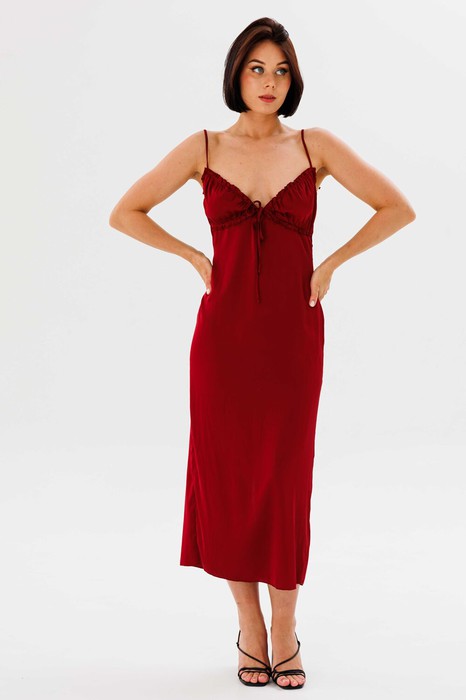Платье-комбинация в длине миди, выполнено из шелка армани. Лиф настрочной, обработан сборкой, верх лифа обработан сборкой на резинку. По центру лифа обработаны декоративные шнурки из основной ткани Застежка- потайная молния по центральному шву спинки. По задней половинке платья обработан разрез