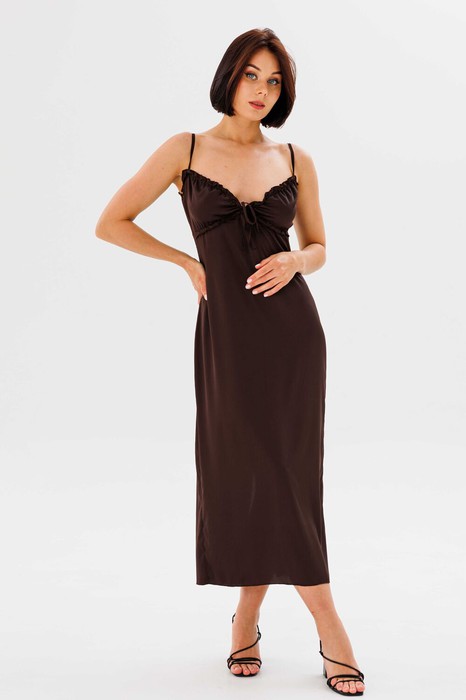 Платье-комбинация в длине миди, выполнено из шелка армани. Лиф настрочной, обработан сборкой, верх лифа обработан сборкой на резинку. По центру лифа обработаны декоративные шнурки из основной ткани Застежка- потайная молния по центральному шву спинки. По задней половинке платья обработан разрез