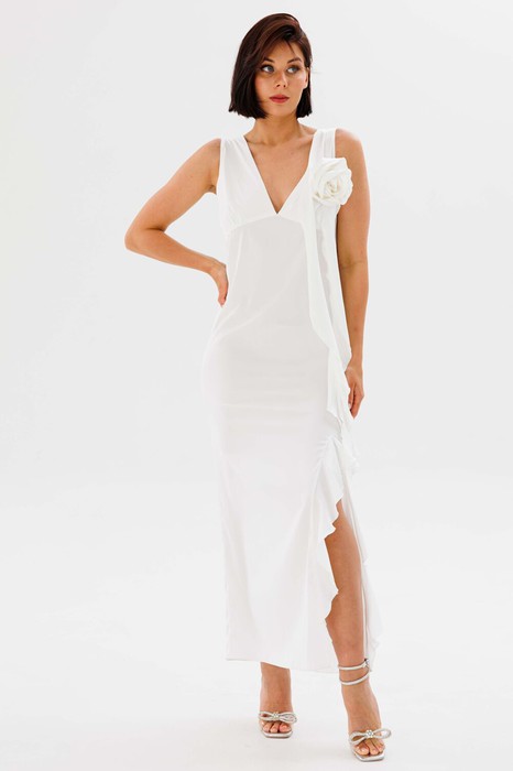 Платье в длине миди, выполнено из шелка армани, лиф отрезной, по переду сбоку обработан вырез с воланом. Застежка - потаная молния в боковом шве. Декор в виде цветка с воланами отстегивается.