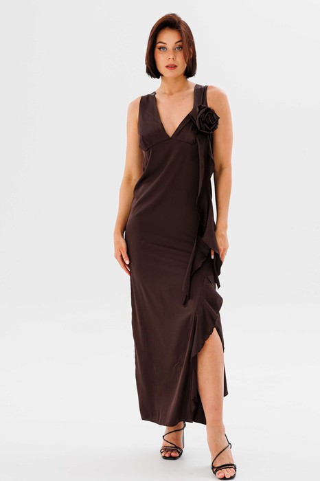 Платье в длине миди, выполнено из шелка армани, лиф отрезной, по переду сбоку обработан вырез с воланом. Застежка - потаная молния в боковом шве. Декор в виде цветка с воланами отстегивается.