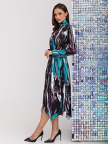Платье в длине мини, рукав втачной, по низу собран на резинку, длина 3/4. застежка - пуговицы по переду и накладной пояс из основной ткани. в боковых швах обработаны карманы. верх лифа обработан притачной стойкой. платье свободного силуэта