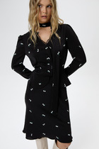 Платье в длине мини. Лиф платья прилегающего силуэта, обработан талиевыми вытачки. Юбка платья пышная, обработаны 2 ярусами воланов. Застёжка - потайная молния по центру спинки. Рука короткий, присборен на резинку, может надеваться на плечо и на предплечье для более игривого образа.