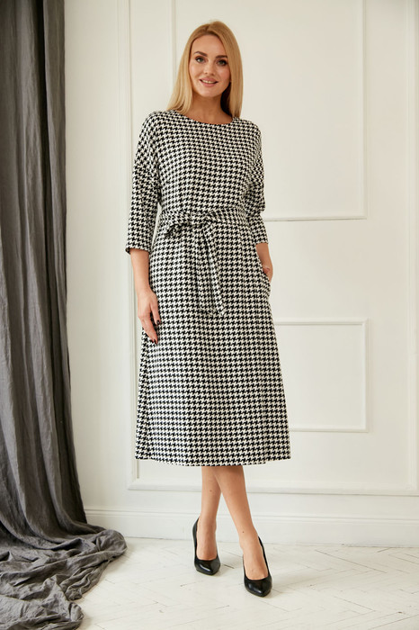 Платье женское из плательной ткани, полуприлегающего силуэта, под пояс из той же ткани, вырез горловины полукруглый, рукав 3/4 длины на спущенной пройме, карманы в боковых швах, по переднему полотнищу юбки-складки, застежка по среднему шву спинки на молнию, изделие без подкладки.