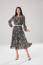 Платье женское свободного силуэта расширенное к низу выполнено из шифона.Перед и спинка с отрезной кокеткой ,нижняя часть выполнена из двух деталей внахлёст со складками по верхнему срезу. На спинке "капелька " и застёжка на навесную петлю и пуговицу. Рукава втачные одношовные длиной 3/4 со сборкой на резинку по низу.Круглый вырез горловины окантован. Платье на атласной подкладке от кокетки.