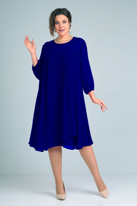Платье женское свободного силуэта расширенное к низу выполнено из шифона.Перед и спинка с отрезной кокеткой ,нижняя часть выполнена из двух деталей внахлёст со складками по верхнему срезу. На спинке "капелька " и застёжка на навесную петлю и пуговицу. Рукава втачные одношовные длиной 3/4 со сборкой на резинку по низу.Круглый вырез горловины окантован. Платье на атласной подкладке от кокетки.