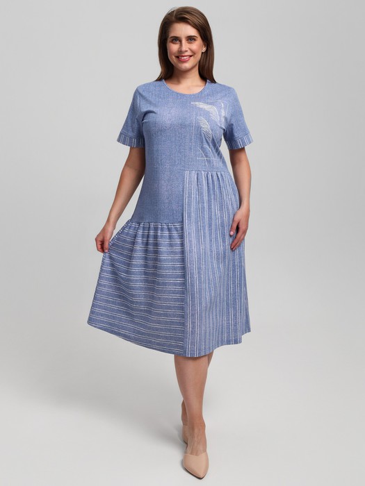 Платье женское из трикотажного полотна «кулирка» с набивным рисунком в комбинации двух видов полотен в единой цветовой гамме, свободного покроя, удлиненное, с короткими втачными рукавами и горловиной овальной формы. Детали переда и спинки с центральным швом, правые и левые детали полочки и спинки отрезные по линии талии и бедер, нижние детали присборены по швам соединения с верхними. На левой полочке выполнена вышивка.