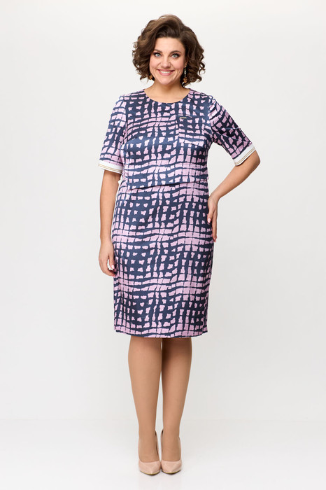 Элегантное женское платье выполнено из плательной ткани с актуальным принтом. Платье полуприлегающего силуэта с отрезной линией талии. Лиф выполнен в виде отлетной детали по низу. Горловина круглая, по линии талии кулиса с декоративным шнуром. По юбке в боковых швах карманы, понизу небольшие разрезы. Рукава втачные, короткие, понизу рукава пришит декоративный довяз. Платье без подкладки.