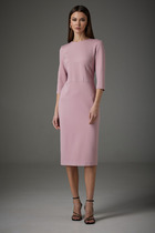 Элегантное женское платье выполнено из хлопка с содержанием эластана. Платье полуприлегающего силуэта. Горловина круглая, собрана на резинку с декоративными бусинам. Застежка в среднем шве спинки на тесьму молния. Рукав реглан, расширенный книзу, длина до локтя. В комплект ходит съемный пояс на пряжке и с декоративным кантом. Платье без подкладки.