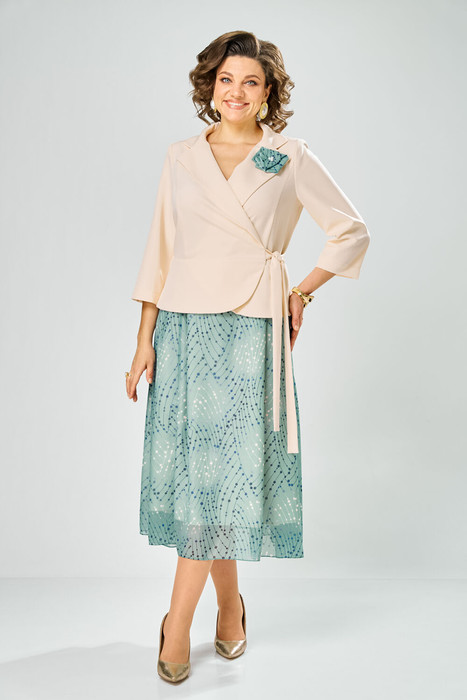 Лиф из плательной ткани, юбка из шифона. Платье с запахом, горловина с воротником пиджачного типа с отложными лацканами. Рукава втачные, длина 3/4.