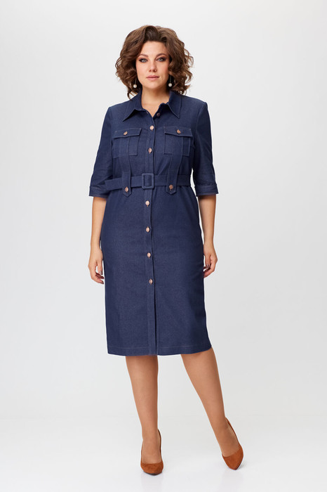 Платье полуприлигающего силуэта с центральной застежкой на кнопки. По переду в верхней части лифа накладные карманы с клапаном и патой переходящей в шлевки на талии, горловина оформлена рубашечным воротником на стойке. Спинка задекорирована нашивкой и шлевкой с кнопкой. Рукава втачные, одношовные.