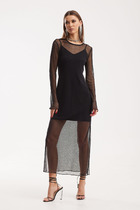 Платье длиной макси, выполнено из струящейся вискозы. По переду и спинке юбка платья выполнена со сборкой. Рукав платья - летучая мышь. По переду выполнена дизайнерская вышивка в виде "россыпи цветов". Длина - 122 см.