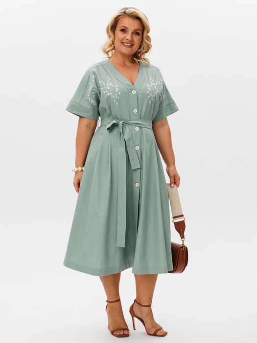 Это элегантное платье из натурального мягкого льна с вискозой идеально подходит для жаркого сезона. Его свободный , но женственный силуэт, подчеркивает красоту и комфорт. Спущенная линия плеча, создающая мягкий расслабленный силуэт, рукав с широкой манжетой. Застежка по переду на пуговицы, в боковых швах карманы, по переду складки от талии, по спинке сборка, длина платья миди, от талии расширенный силуэт. Акцент сделан на дизайнерскую вышивку. В комплекте идет пояс из основной ткани. Идеально ,для прогулок, на работу, встреч с друзьями или летнего отпуска.  Длина - 115 см