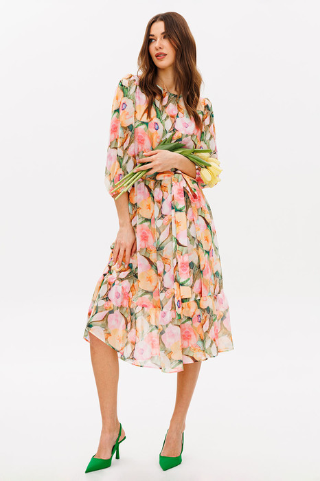 Платье расширенного силуэта, отрезное по линии талии, с втачным рукавом 3/4 со сборкой по окату и внизу на резинке. Полочка и спинка с притачными слегка присборенным воланом по низу. Спинка с вырезом-каплей и затежкой на новестную петлю-пуговицу. Платье с поясом из основной ткани. Длина миди. Платье на подкладке.