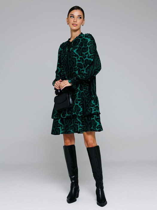Платье А-силуэта. С втачным рукавом на резинках внизу. Полочка и спинка с притачными воланами по низу. Платье на подкладке. Воротник-стойка переходящий в завязку спереди. Горловина округлая с вырезом-каплей по переду.