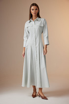 Платье полуприлегающего силуэта отрезное по линии талии, нижняя часть расширена, с воланом по низу. Платье с втачным рукавом со сборкой по окату и внизу на резинке. Лиф с V-образным вырезом и имитацией центральной застежкой на пуговицы. По спинке и переду вставка на талии с резинками. По горловине стойка с рюшей, которая завязывается по переду. Платье на подкладке.
