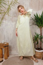 По полочке обработана кокетка, в которую вставлен притачной волан, переходящий на рукав. Спинка цельная. На спинке застежка на петлю и пуговицу. Рукав втачной одношовный, низ рукава на резинке. Платье на текстильной вискозной подкладке.