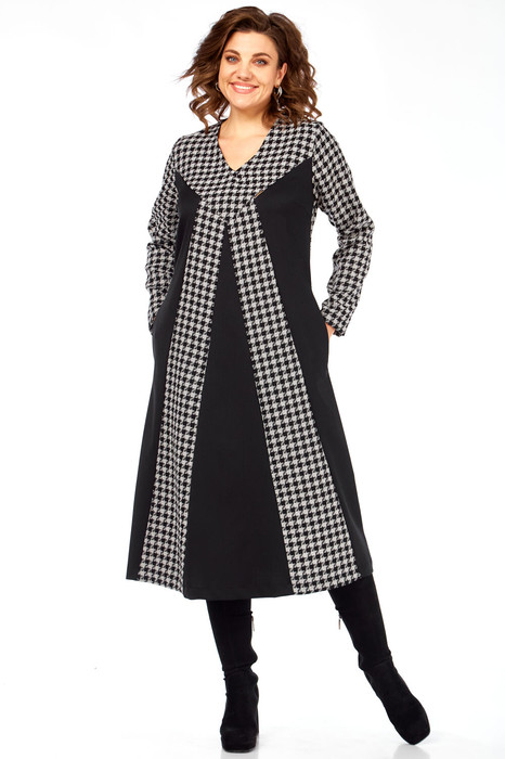 Платье миди в графичном дизайне в свободном А-силуэте, плавно расширяющийся от груди к низу, обеспечивающий максимальный комфорт и непринужденную элегантность. Классический V-образный вырез, который визуально удлиняет шею. Рукава и часть лифа (верхняя внешняя часть плеч и рук) выполнены из ткани с классическим черно-белым принтом "гусиная лапка". Центральная часть лифа спереди оформлена двумя крупными, контрастными черными треугольными вставками, которые сходятся к вершине V-образного выреза. Эти вставки создают четкий, динамичный геометрический рисунок. Рукава длинные, втачные, из ткани "гусиная лапка", без дополнительных декоративных элементов на манжетах. Спинка платья безцентрального шва с выточками для лучшего прилегания модели. В платье имеются боковые карманы для большего удобства. Длина рукава 62 см длина платья 115 см.