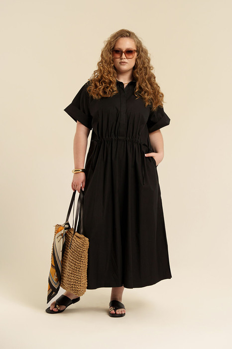 Платье женское свободного покроя из хлопковой ткани. Вырез горловины оформлен воротником рубашечного типа. Застежка- планка с потайными пуговицами. Рукава- реглан, переходящий в кокетки. На спинке- небольшая сборка в области лопаток. Имеются карманы в боковых швах. Спереди и сзади выполнены декоративные элементы в виде кулисы со шнурками. При их помощи можно регулировать объем талии и создавать приталенный силуэт. В боковых швах имеются разрезы.