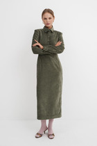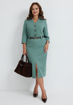 Платье женское полуприлегающего силуэта. Линия плеча спущена. По спинке средний шов. Перед из двух деталей, верхняя деталь отлетная, фиксируется съёмным поясом. V-образный вырез горловины. Обработка деталей переда, проймы, низа изделия - окантовкой.
