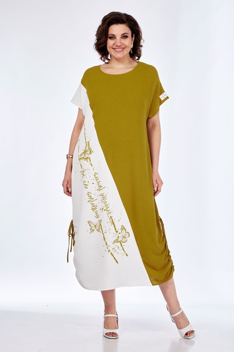 Платье женское свободного кроя расклешенное к низу. Спинка со средним швом. Перед с ассиметричным разрезом подиагонали. Правая часть переда из отделочной ткани с печатью в виде бабочек. Горловина округлой формы. По бокам внизу обработаны кулисы с завязками. Платье со спущенной линией плеча.