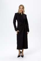 Платье женское длиной до середины икры, слегка расклешенное к низу. Спинка с косым передом в области талии и средним швом до разреза. Перед с косым подрезом в области талии, образующий мягкую складку  из лифа и 1 глубокую складку от подреза вниз. Горловина с рубашечным воротником на стойке и драпировкой в виде качели. Рукав втачной с отложными манжетами.