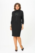 Платье женское длиной до середины икры, слегка расклешенное к низу. Спинка с косым передом в области талии и средним швом до разреза. Перед с косым подрезом в области талии, образующий мягкую складку из лифа и 1 глубокую складку от подреза вниз. Горловина с рубашечным воротником на стойке и драпировкой в виде качели. Рукав втачной с отложными манжетами.
