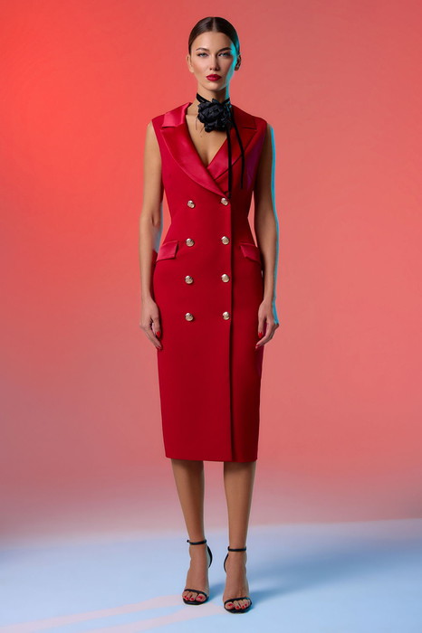 Платье женское полуприлегающего силуэта из платьево-костюмной ткани. Смещённые рельефы с нагрудными вытачками выходят из проймы, переходят в подрез ниже линии талии. Шов закрывают нашивные клапаны из атласа. Спинка с талевыми вытачками и средним швом. Воротник пиджачного типа с отрезными лацканами из атласа, воротник стояче отложной из атласа. Застёжка центральная, двубортная, на петли пуговицы в два ряда. Пройма обработана обтачкой.