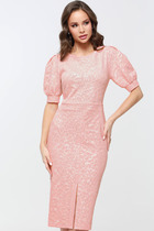 Платье прилегающего силуэта, длиной за колено. С декоративным вырезом по переду. Спинка с талиевыми вытачками и средним швом, в котором обработана застежка на потайную тесьму-*молнию* и шлица. По горловине спинки разрез с застежкой на пуговицу. Платье с нагрудными и талиевыми вытачками и кокеткой из отделочной ткани ( сетка).