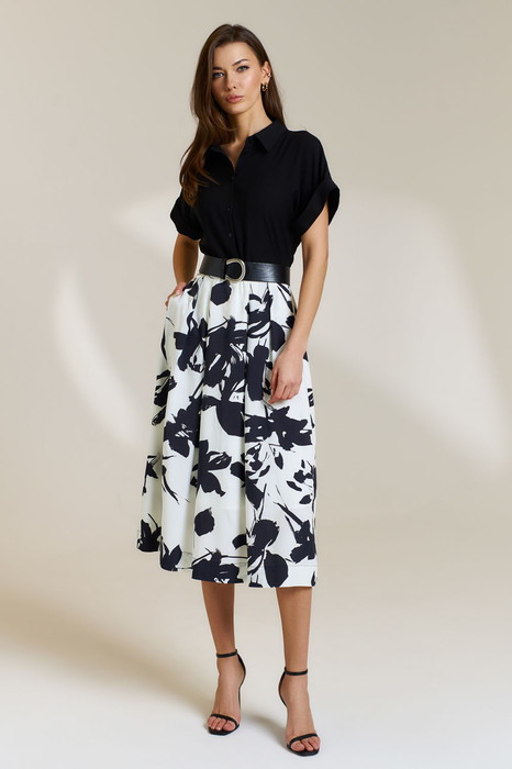 Платье женское приталенного силуэта на подкладке по юбке. Воротник отложной на стойке, планки по лифу цельнокроеные, рукав спущенный цельнокроеный с притачной отложной манжетой. Юбка со складками, с карманами "хулиганами". Застежка по лифу на пробивные петли и пришивные пуговицы, по спинке потайная молния. В комплекте имеется широкий пояс на пряжке из экокожи.