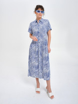 Платье-трапеция с вытачками на груди и широким воланом внизу, который выкроен по кругу. Воротник отложной, со стойкой. Спереди шнуровка с металлическими люверсами. Рукав короткий, втачной с манжетом, подогнутым вверх. Модель выполнена из костюмной, вискозной ткани высокого качества, с плетением "под лен".