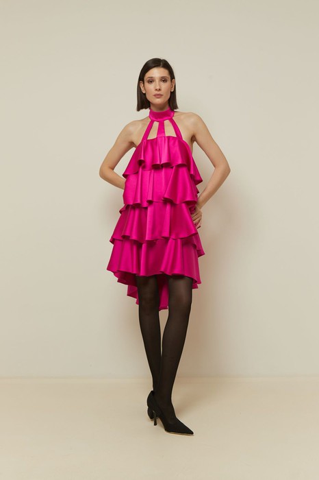 Платье женское на подкладке, А-силуэта, длина мини. На спинке и переде воланы в 4 яруса. Горловина- стойка, застегивается на 3 навесные петли и пуговицы. На спинке перекрестные бретели.