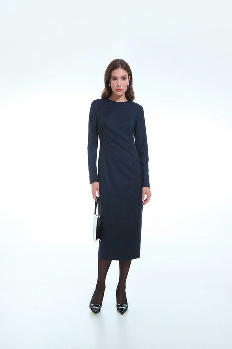 Платье женское прилегающего силуэта, длиной ниже колен. На спинке застежка-молния, в нижней части среднего шва шлица. Рукава длинные.