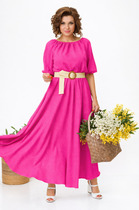 Платье женское, полуприлегающего силуэта, по переду фигурный подрез, рельефы и накладной карман. Верхняя часть спинки на запах, нижняя часть со средним швом, вытачками и втачным поясом. Застежка платья на потайную молнию в среднем шве и поясом с полукольцами, который позволяет регулировать прилегание в области талии. Вырез горловины "лодочка". Линия плеча спущена. Рукав втачной, объемный, со швами, шлицей притачной манжетой.