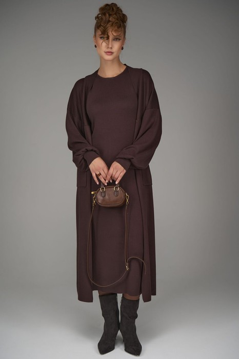 Элегантное платье-двойка в благородных оттенках. Лаконичное платье прямого кроя сочетается с удлинённым кардиганом на мягкой посадке. Образ подчеркивает утончённость и создаёт эффект безупречной простоты. Универсальный комплект для офиса, деловых встреч и стильных выходов в город. Легко комбинируется с обувью на каблуке и аксессуарами в тон.