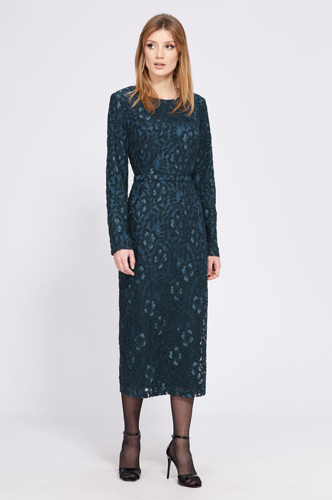 Платье выполнено из гипюра. Платье приталенного силуэта длиной миди. В среднем шве спинки разрез и застежка на потайную молнию. Горловина округлой формы. Платье с плечевыми накладками. Рукав втачной, одношовный. Платье на отлетной по низу подкладке из атласа. В комплект входит пояс из основной ткани с застежкой на кнопки.