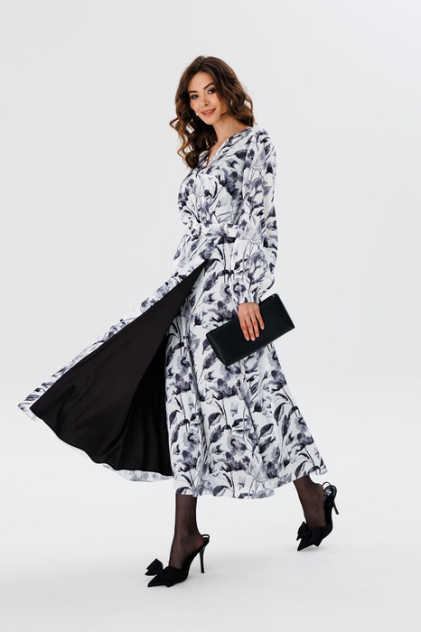 Платье выполнено из креп-атласа с принтом. Платье Х-образного силуэта, отрезное по линии талии, длиной миди. Перед выполнен "на запах" со складками по линии талии. Спинка цельная. Вырез V-образной формы. Рукав втачной, одношовный, с напуском. Низ рукава собран на эластичной тесьме. Юбка расширена к низу. Платье на отлетной по низу атласной подкладке. В комплект входит съемный ремень с обтяжной пряжкой.