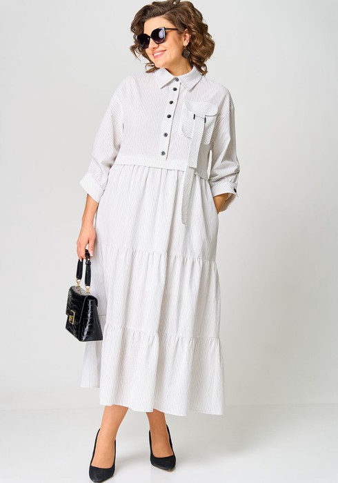 Платье женское повседневное полуприлегаюшего силуэта до талии с расширенной юбкой , выполнено из однотонного хлопка в полоску. Вырез горловины воротник на стойке рубашечного типа,застежка планка на обметанные петли и пуговицы, плечо спущенное , рукав втачной по низу на притачной манжете . В рукаве притачная пата с помощью которой можно менять длину рукава. Юбка из трех воланов на подкладке,в боковых швах обработаны карманы.На левой стороне полочки платья накладной карман с пряжкой . Декором платья служат отделочные пуговицы и накладной карман с пряжкой .