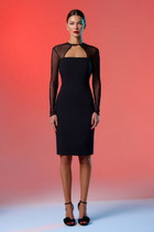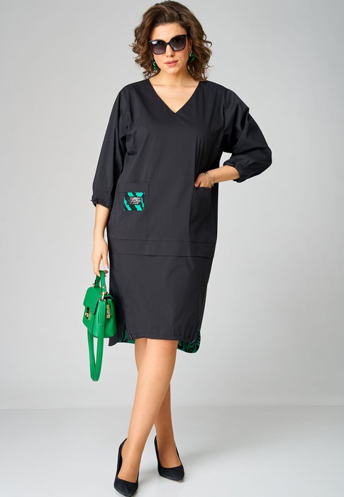 Платье женское повседневное прямого силуэта с фигурным низом. Выполнено из однотонного хлопка в сочетании с отделоной тканью с анималистичным принтом. Вырез горловины V-образного типа, рукав втачной со складками по низу с резинкой на фиксаторе, по полочке платья накладные карманы и два разреза. Горловина спинки с фигурным вырезом и пряжкой. Декором служат элементы из отделочной ткани.