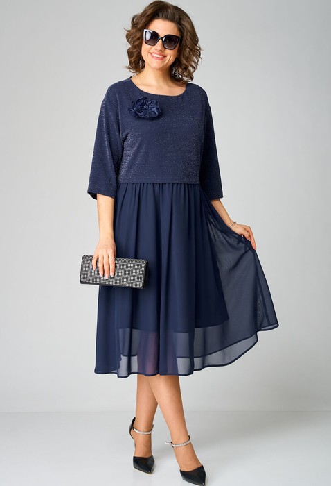 Платье женское нарядное полуприлегающего силуэта до талии, расширенное к низу отгрезное по талии. Выполнено из трикотажного полотна в сочетании с шифоном. Вырез горловины круглый обработан обтачкой, по спинке застежка на навесную петлю и пуговицу. Рукав втачной 3/4. Юбка из шифона на подкладке, по талии собрана на сборку. Декором служит съемный цветок.