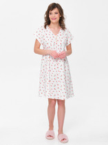 Платье женское нарядно-повседневное А-образного силуэта, выполненео из креп-шифона. Платье на трикотажной подкладке. Вырез горловины круглый на обтаке, по спинке астежка на навесную петлю и пуговицу. Рукав втачной по низу собран на резинку. В бокох швах обработаны разрезы, низ платья фигурый.Декором платья служит принт самой ткани. Пояс в комплекте.