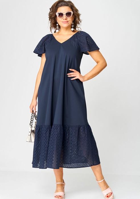 Платье женское нарядно-повседневное выполнено из однотонного хлопка в сочетании с отделочной тканью (шитье). Вырез горловины V-образный. Рукав втачной "реглан" по спинке и полочке собран на резинку. По низу платья притачной волан из отделочной ткани(шитье0. В боковых швах обработаны карманы. Декорм платья служат детали из отделочной ткани.