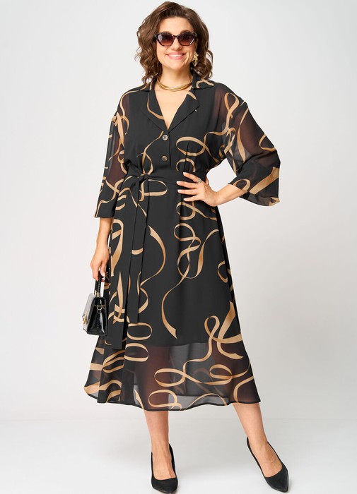 Платье женское нарядно-повседневное полуприлегающего силуэта до талии расширенное к низу. Плье отрезное по талии. Выполнено из креп-шифона. Вырез горловины отложной воротник с подбортами, до талии застежка на обметанные петли и пуговицы. Рукав втачной по низу собран на резинку. от талии юбка платья на трикотажной подкладке. Декором платья служит съемный пояс и принт самой ткани.