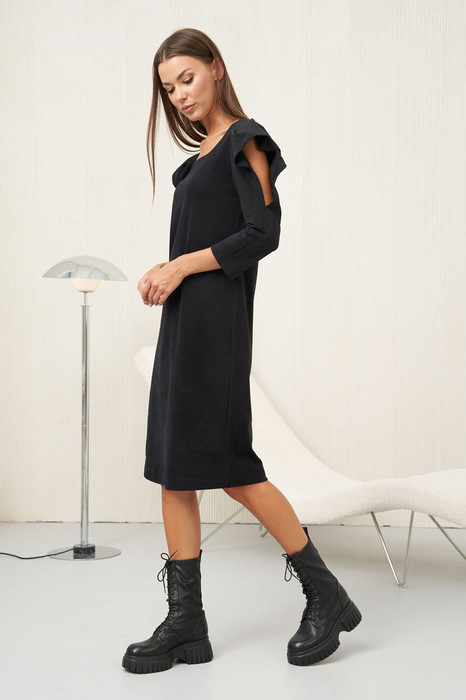 Платье - предмет номер один в нашем гардеробе. Мы любим их за универсальность, ведь это 80% всего нашего образа. Невероятно комфортное, из мягкого супер-эластичного трикотажного полотна с легким эффектом замша в классическом черном цвете. О чем еще может мечтать любая из нас. Свободный упрямленный покрой, рукав необычной формы со складками и интригующей каплей в верхней части длиной 3/4. Вырез каре со слегка скругленными углами. Длина рукава около 42 см. Длина платья коло 102 см.