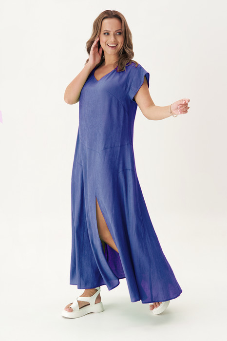 Свободный А-силуэт с цельнокроенным рукавом, ассиметричные линии членения отрезной нижней части платья с коническими вставками и эффектным разрезом. Оригинальный вырез горловины с завязкой-бантом на спинке.