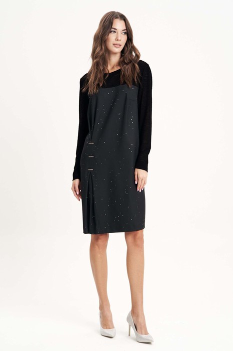 Свободный упрямлённый силуэт, втачной рукав, круглая горловина. Полочка с отрезной кокеткой, ассиметричным рельефом со встречной складкой и разрезом, нагрудной вытачкой. Спинка с центральным швом и отрезной фигурной кокеткой. Рукав зауженный, длинный. Кокетка полочки, спинка и рукава - из мягкого вискозного фактурного трикотажа. Полочка и спинка - из эффектного поливискозного полотна с лёгким вкраплением пайетки.