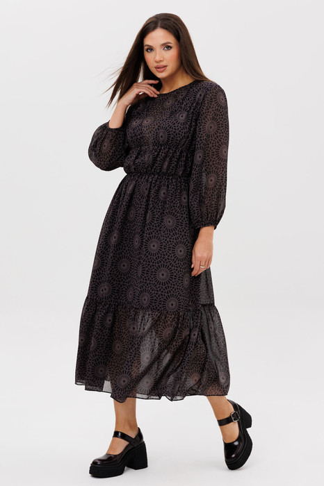Легкое и воздушное, микс нежности и дерзости, воплощенный в комбинации противоположностей: нежного шифона и геометрического принта. А-образный силуэт, втачной рукав, со сборкой по низу, круглая горловина. Платье отрезное, чуть выше линии талии, лиф полочки с V-образным подрезом и легкой сборкой в боковой части на эластичную венгерку. Боковая часть на подкладке. Лиф спинки со средним швом и застежкой. По линии талии-эластичная тесьма.