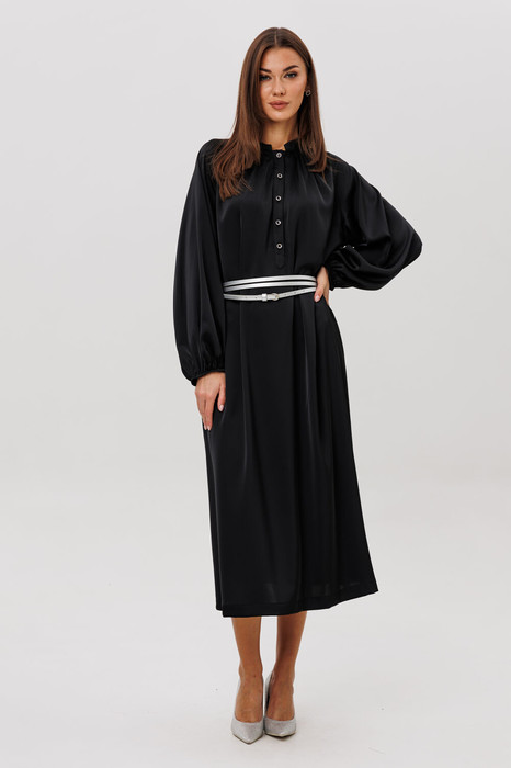 Платье из гладкого атласного полотна свободного рубашечного покроя. Модель выполнена с мягкой сборкой по горловине, застёжкой на пуговицы и объёмными рукавами на манжете. Акцентом выступают эффектные серебристые пояса, подчёркивающие талию и добавляющие образу современный, элегантный штрих. Ideal для деловых встреч, ужинов и особых выходов.