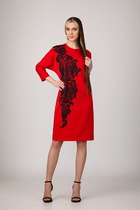 Двухшовные рукава с манжетами на кнопке — изысканная деталь, а открытый срез по низу платья — смелый дизайнерский жест. Завершающий акцент — декоративная брошь, как точка в изящной фразе.